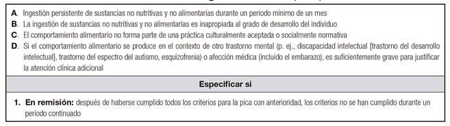 En remisión: después de haberse cumplido todos los criterios para la pica con anterioridad, los criterios no se han cumplido durante un periodo continuado.