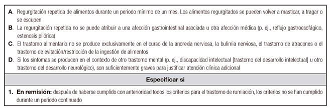 En remisión: después de haberse cumplido con anterioridad todos los criterios para el trastorno de rumiación, los criterios no se han cumplido durante un periodo continuado.