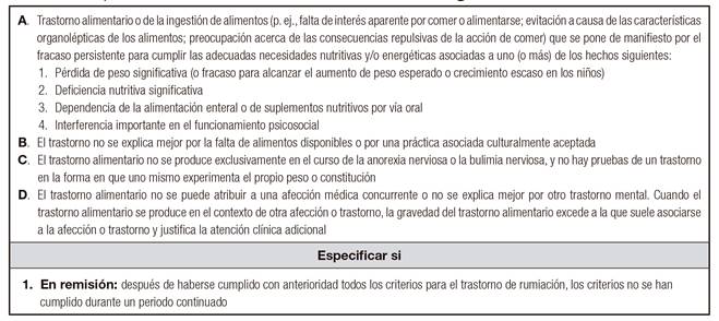 Trastorno alimentario o de la ingestión de alimentos (p. ej., falta de interés aparente por comer o alimentarse; evitación a causa de las características organolépticas de los alimentos; preocupación acerca de las consecuencias repulsivas de la acción de comer) que se pone de manifiesto por el fracaso persistente para cumplir las adecuadas necesidades nutritivas y/o energéticas asociadas a uno (o más) de los hechos siguientes 13: