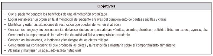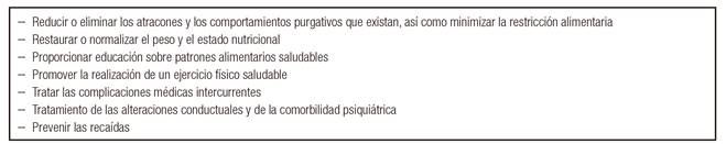 Se dispone de diversas herramientas terapéuticas para el tratamiento de estos pacientes. El abordaje nutricional contempla el consejo dietético individualizado que garantice un adecuado estado nutricional y la correcta educación nutricional. Su objetivo es facilitar la adopción voluntaria de comportamientos alimentarios que fomenten la salud y que permitan la modificación a largo plazo de los hábitos alimentarios y el cese de conductas purgantes y atracones.