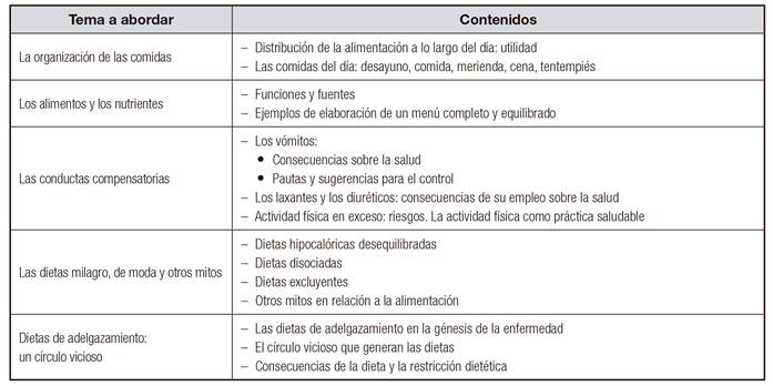 There are many therapeutic tools available for the treatment of these patients. The nutritional approach contemplates the individualized dietary advice which guarantees an adequate nutritional state and nutritional education. Its objective is to facilitate the voluntary adoption of eating behaviors that promote health and allow the long-term modification of eating habits and the cessation of purgatory and bingeing behaviors.