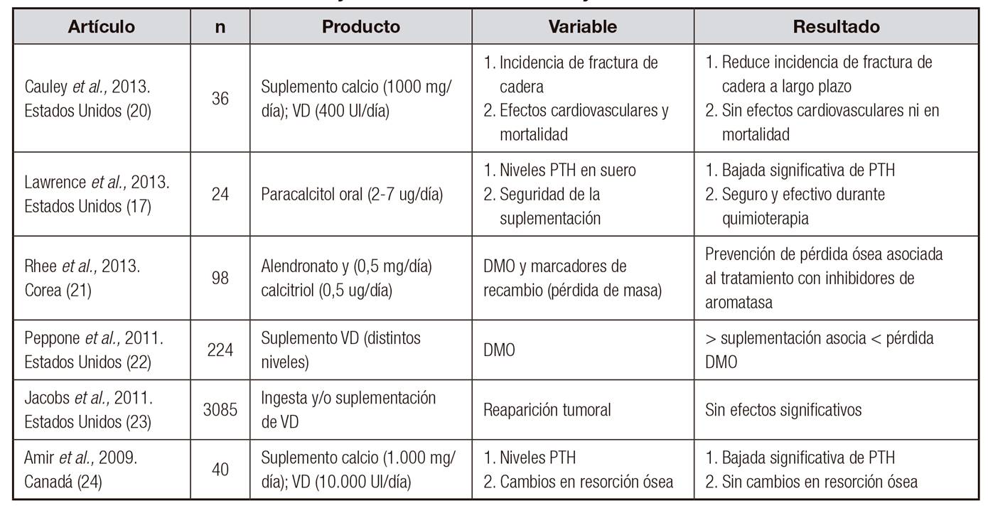Preservar la resistencia de los huesos es vital para contribuir al mantenimiento de la calidad de vida de mujeres que padecen o han padecido CM 14, especialmente con tratamientos antiestrogénicos en tumores hormonodependientes, que promueven la disminución de la densidad mineral ósea 15. Por esta razón, parece importante garantizar niveles adecuados de VD en sangre en las mujeres con CM.