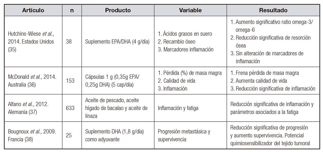 Hasta la fecha no existe ninguna recomendación específica incluida en las guías de práctica clínica de mujeres con tratamiento o seguimiento de CM de suplementar con omega-3. Sin embargo, la mayoría de estas guías recogen la necesidad de recomendar el incremento del consumo de pescado azul en la dieta de las pacientes 25,26.