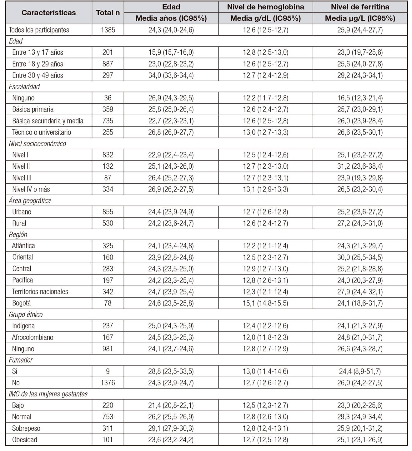 El estudio estuvo constituido por 201 mujeres gestantes de 13 a 17 años, 887 de 18 a 29 años y 297 de 30 a 49 años, para un total de 1.385 mujeres gestantes (media 24,3 años, IC95% = 24,0-24,6 años). El nivel de ferritina fue de 1,5 a 387,4 µg/L (media 25,9 µg/L, IC95% = 24,4-27,7 µg/L). El nivel de hemoglobina fue de 7,3 a 19,0 g/dL (media 12,7 g/dL, IC95% = 12,5-12,8 g/dL). Tener entre 13 y 17 años, no tener escolaridad, pertenecer al nivel socioeconómico III y tener un índice de masa corporal gestacional bajo mostraron las concentraciones de ferritina promedio más bajas (23,0 μg/L, 16,5 μg/L, 23,9 μg/L y 23,0 μg/L, respectivamente). En cuanto a los valores promedio más bajo en las concentraciones de hemoglobina estos se encontraron en mujeres sin escolaridad, de la región atlántica o territorios nacionales y que sean indígenas y afrocolombianas (12,2 g/dL, 12,2 g/dL, 12,3 g/dL, 12,4 g/dL y 12,0 g/dL, respectivamente) (Tabla 1).