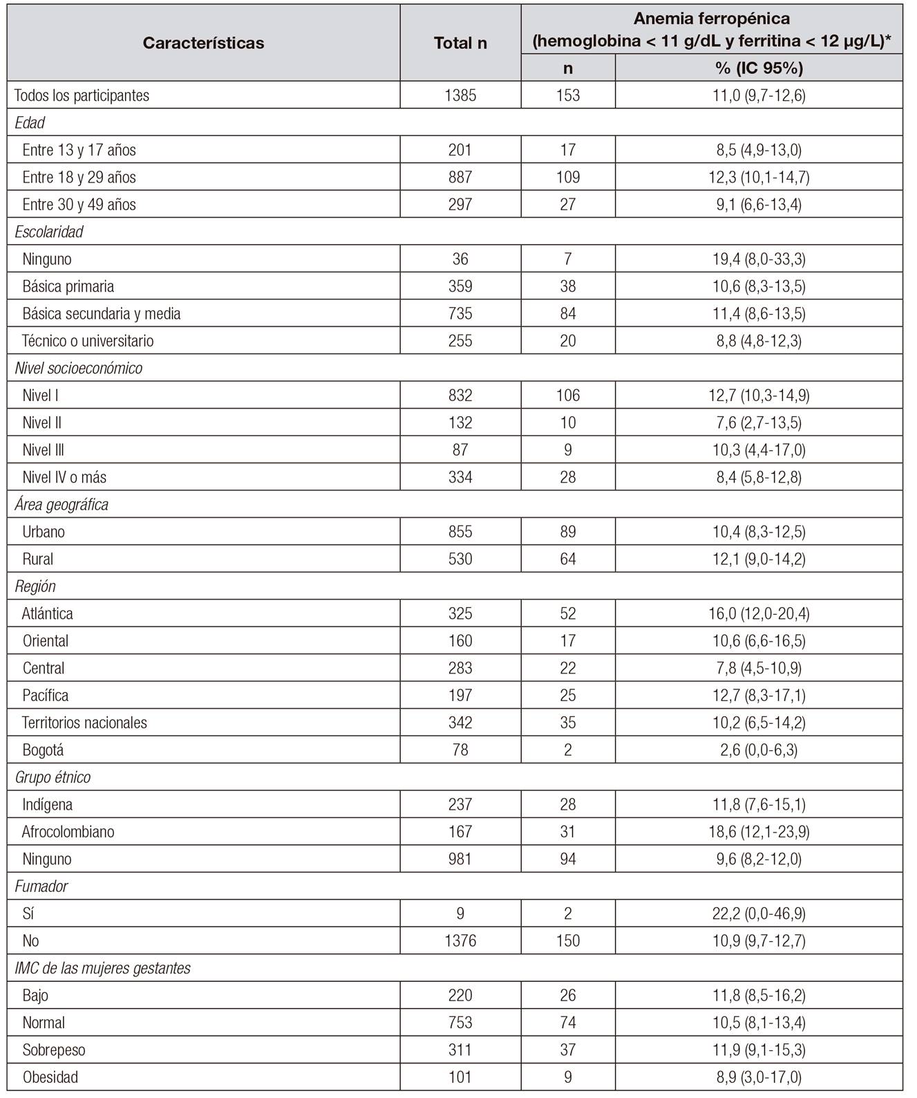 Resultados: la prevalencia global de anemia ferropénica (hemoglobina < 11 g/dL y ferritina < 12 µg/L) fue de 11,0% (IC95% = 9,7-12,6). Las prevalencias más altas se encontraron en mujeres sin ningún grado de escolaridad (19,4%; IC95% = 8,0-33,3), mujeres del nivel I socioeconómico (12,7%; IC95% = 10,3-14,9) que habitan en la región atlántica o pacífica (16,0%; IC95% = 12,0-20,4 y 12,7%; IC95% = 8,3-17,1, respectivamente) y mujeres afrocolombianas (18,6%; IC95% = 12,1-23,9).