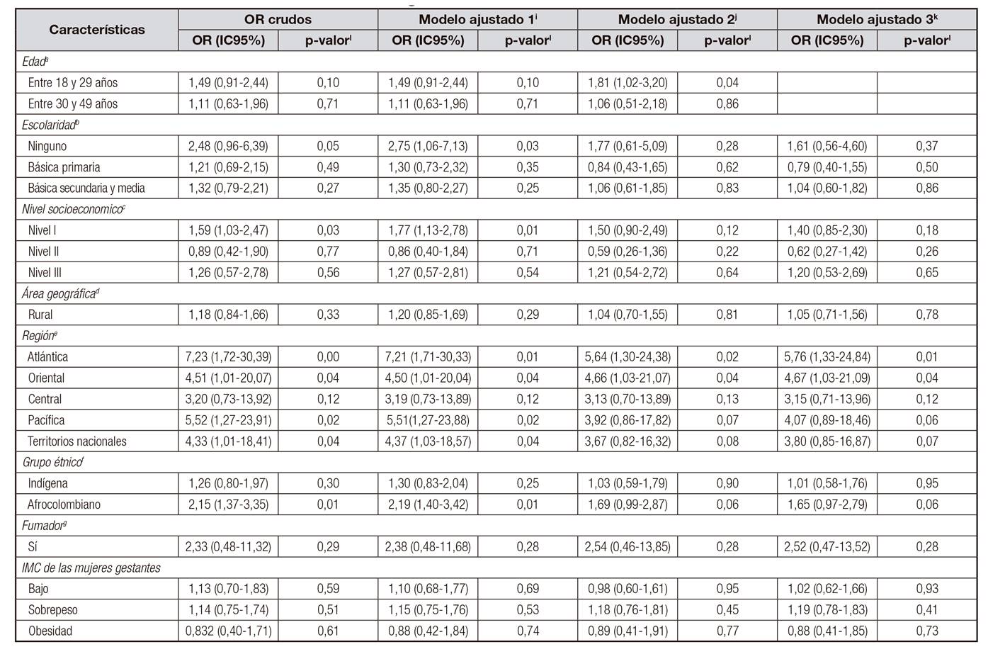 Igualmente, se definieron las siguientes variables sociodemográficas: edad: entre 13 y 17 años, entre 18 y 29 años y entre 30 y 49 años; escolaridad: ninguna, básica primaria, básica secundaria y media, y técnico o universitario; área o procedencia: urbana o rural; la etnicidad se estableció en base a la pertenencia a un grupo étnico por autorreconocimiento (indígena, y raizal del archipiélago, palenquero, negro o afrocolombiano); la posición socioeconómica fue determinada de acuerdo al Sistema de identificación de posibles beneficiarios de programas sociales en Colombia-SISBEN III (1 al 4), siendo el nivel 1 el de mayor pobreza y el nivel 4 el de menor o no pobreza. Dicha clasificación es una medida desarrollada por el Departamento de Planeación Nacional de Colombia, en la que se tienen en cuenta características sociodemográficas, condiciones de vida y acceso a servicios públicos; región del país donde se reside: atlántica, oriental, central, pacífica, territorios nacionales, Bogotá; hábito tabáquico e índice de masa corporal gestacional IMC-G; en cuanto a las medidas de peso de las primeras 6 semanas de embarazo son muy similares a las de una mujer no-embarazada, por lo cual no se usaron los criterios de IMC-G sino los de IMC para adultos en general 18,19,20.