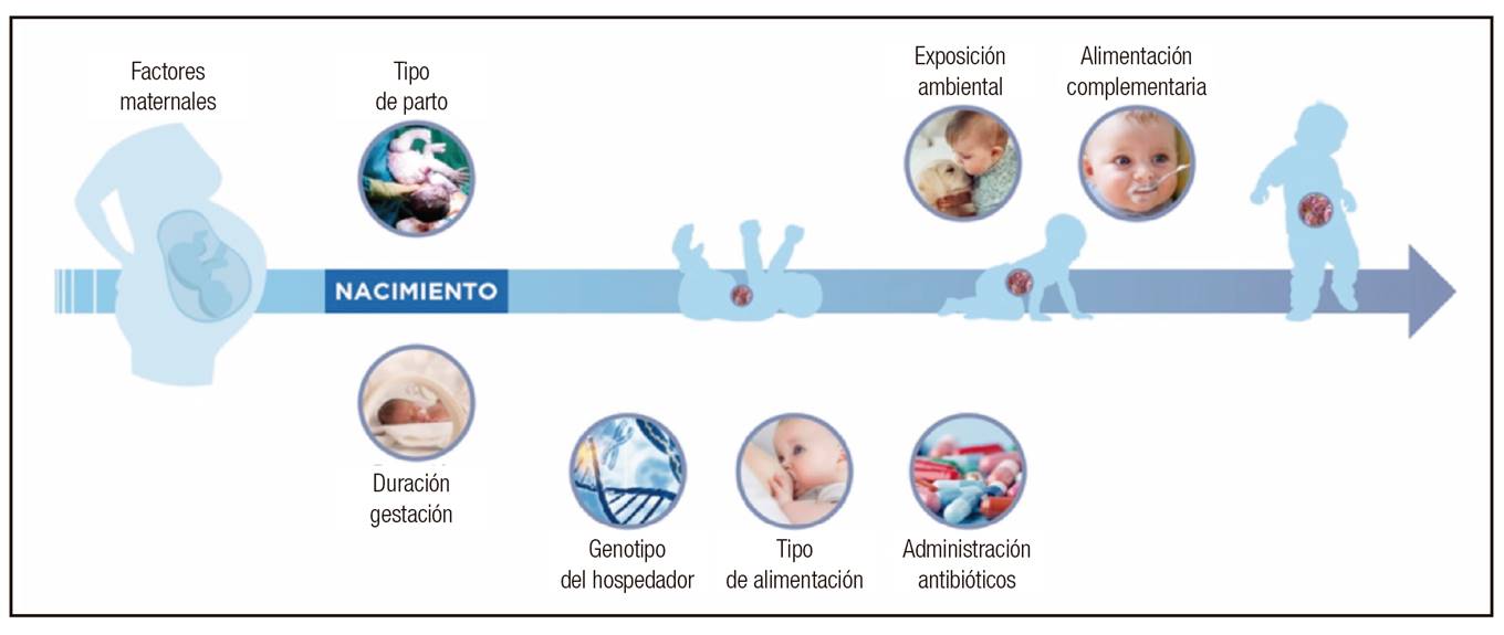 La colonización microbiana del niño sucede de un modo paralelo con la maduración de su sistema inmunitario y desempeña un importante papel en la fisiología intestinal, así como también en el metabolismo. El establecimiento de la microbiota intestinal es un proceso dinámico, influenciado por factores ambientales tales como el tipo de parto, la exposición a microorganismos del ambiente, el uso de antibióticos, la prematuridad, el tipo de alimentación tanto de la madre como del lactante, así como también el genotipo del hospedador (Fig. 2).