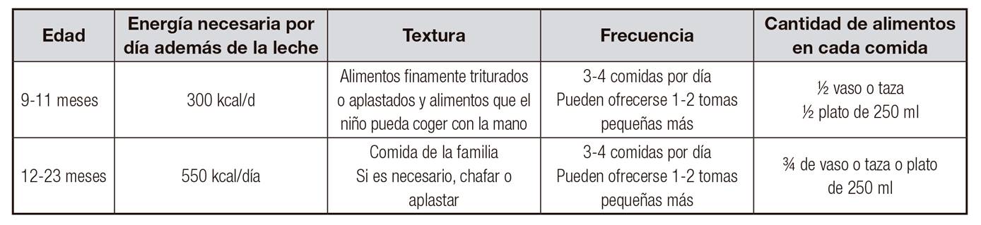 El primer año de vida es un periodo de máximo crecimiento y desarrollo de los distintos aparatos y sistemas y, por tanto, de riesgo nutricional. La evolución de la alimentación del niño en este periodo está condicionada fundamentalmente por su curva de crecimiento y por el desarrollo de su aparato digestivo, renal y sistema nervioso. Las recomendaciones actuales sitúan la introducción de la alimentación complementaria nunca antes del cuarto mes (semana 17) y preferiblemente alrededor del sexto mes (no posterior). El motivo por el que se deben introducir en este momento los alimentos sólidos y líquidos, distintos de la leche, es fundamentalmente nutricional. La leche materna continúa siendo el alimento principal, pero no suficiente para cubrir las necesidades de macro y micronutrientes. Todos estos factores marcan una impronta metabólica que va a condicionar la salud del niño a corto, medio y largo plazo. La introducción de la alimentación complementaria es una ventana de oportunidad para la promoción de la salud que, además, podemos modular con facilidad.