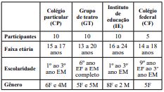 As oficinas foram realizadas em quatro instituições distintas: em um colégio particular (CP) localizado na Zona Sul do Rio de Janeiro; em um grupo de teatro (GT) localizado em um Centro de Cidadania da Prefeitura do Rio de Janeiro nas proximidades de uma grande favela na Zona Sul; em um instituto de educação (IE) estadual localizado na Zona Metropolitana do Rio de Janeiro; e em um colégio federal (CF) localizado na Zona Sul do Rio de Janeiro.