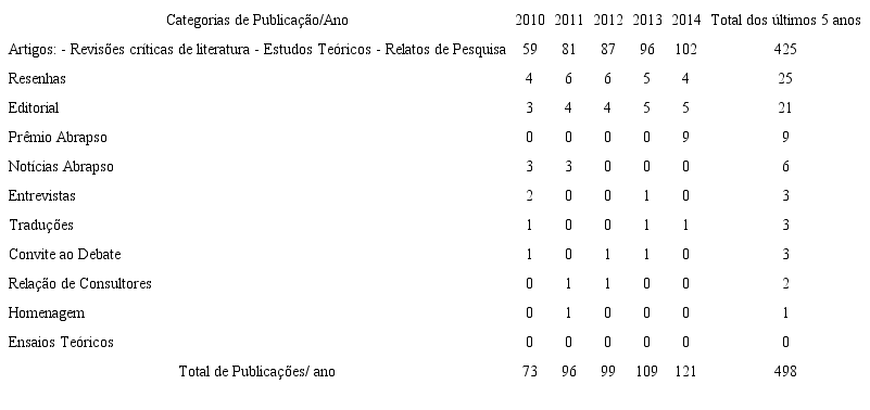 Foi possível observar que, nos últimos cinco anos, o periódico publicou 498 trabalhos, de modo crescente. Constatou-se que, de 2010 a 2014, não houve nenhuma publicação na categoria Ensaios teóricos. Os itens Homenagem, Relação de consultores, Convite ao debate, Traduções e Entrevistas somaram poucas publicações, havendo apenas de uma a três em todo o período analisado.