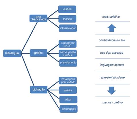 A hierarquia existente entre os três campos elencados (Arte Chancelada, Grafite e Pichação) é organizada pela população de forma que, ainda que as pessoas entrem em contato com pichações com maior frequência do que obras de arte, as pichações são entendidas como menos representativas, posto que seus atores, materiais, locais de realização etc. se valem de aspectos que se encontram fora do campo de visibilidade e legitimação artística, engendrando práticas policialescas e uma partilha do sensível que não obedece completamente à materialidade cotidiana.