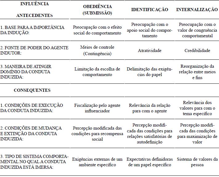 As motivações subjacentes a cada processo são subdivididas entre aquelas reguladas por interesses instrumentais (assegurar obter recompensas e evitar punições, viver de acordo com as expectativas do próprio papel, maximizar os valores) e aquelas reguladas por interesses de automanutenção (gerenciar a imagem pública, viver os papéis de acordo com os próprios modelos, confirmar o autoconceito) (Kelman, 2006). Kelman distingue esses processos em termos de antecedentes e consequentes, resumindo-os conforme a Tabela 1.