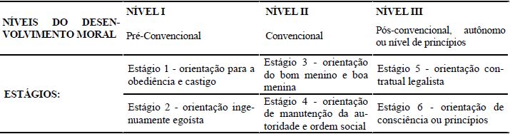Quanto ao desenvolvimento cognitivo, o período intuitivo pré-operacional é necessário para atingir o Nível I - Pré-convencional. Em seguida, é necessário ter consolidado as operações concretas para uma pessoa atingir o Nível II - Moral Convencional. Da mesma forma, é preciso que as operações formais tenham sido desenvolvidas completamente para que essa pessoa possa atingir o Nível III - Moral Pós-convencional. (Rique et al., 2013, p. 246)