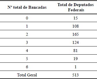 Se avaliarmos a representatividade social dos deputados federais do Brasil em 2016 em função dos grupos de interesses - bancadas -, conforme a Tabela 3, podemos fazer uma inferência.