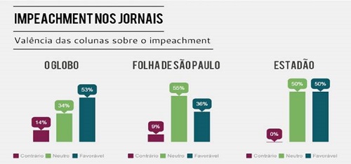 No caso da Folha de S. Paulo, são identificadas quatro vezes mais colunas favoráveis ao afastamento (36%) da presidente do que contrárias (9%) ao mesmo. Quando os dados sobre a publicação são contextualizados em uma análise consolidada das três publicações brasileiras, o resultado surpreende. Tal como é anunciado na página, a proporção entre colunistas favoráveis e contrários ao impeachment é de 10 vezes mais colunistas favoráveis. (Manchetômetro, 2016). A análise quantitativa das colunas correlacionada com a análise qualitativa evidencia um direcionamento adotado, em bloco, pelos órgãos de comunicação. Estes atuam conjuntamente no sentido de formar, na opinião pública, a ideia de que o afastamento da presidente é o melhor desenlace para o momento histórico vivido pelo Brasil.