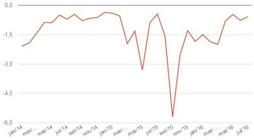 A sequência de manchetes de capa oferecida pelo jornal, se analisada conjuntamente, oferece um conjunto de dados sobre o posicionamento do jornal. Tais dados, como vimos, podem ser refletidos pelo instrumento da análise de viés, evidenciando o interesse do jornal, bem como seus esforços para que o acontecimento enunciado evolua em uma dada direção. Na página eletrônica do Manchetômetro, um acompanhamento sistemático das capas da Folha de S. Paulo feito entre janeiro de 2014 e maio de 2016 revela que, ao longo de todo esse período, o índice de viés manteve-se negativo, sendo que em alguns intervalos tornou-se altamente negativo. Predominam largamente assim as capas contrárias à permanência da presidente Dilma Rousseff, ao seu governo e ao seu partido. A constância do índice negativo evidencia a posição política do jornal, categoricamente contrária ao governo eleito. Os dados demonstram que o jornal desconsidera o tão propalado pluralismo de posicionamentos que, ostensivamente, se auto atribui. É o que pode ser visto na Figura 2: