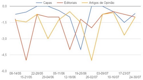 Ao acompanhamento longitudinal, é possível acrescentar o acompanhamento de um período menor, agora realizado sobre três componentes do jornal. O resultado, que pode ser visto na Figura 3, demonstra que em cada um dos componentes analisados (capas, editoriais e artigos de opinião) o viés manteve-se negativo na totalidade do período analisado, com largo predomínio de conteúdos contrários à manutenção da presidente.