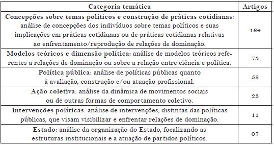 A escolha pela categoria temática Políticas Públicas decorre de ser a com maior crescimento proporcional no número de publicações no período entre 1995 e 2014 (ver Tabela 2), o que sugere uma ampliação da reflexão sobre direitos sociais através da intervenção do Estado. Em termos acadêmicos, a produção sobre políticas públicas é importante devido a relevância da crítica sobre o papel destas políticas no processo de democratização social. Em termos profissionais, cabe-nos ressaltar que as políticas públicas têm sido, desde a redemocratização do país, um dos principais espaços de inserção profissional de psicólogos no Brasil.