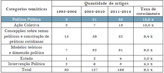 Esta diferença numérica pode ser observada em todas as categorias temáticas, sendo “Intervenção política” (4,5 vezes) a categoria com menor crescimento e “Política Pública” (18 vezes) a categoria com maior crescimento no período entre 1995 e 2014.