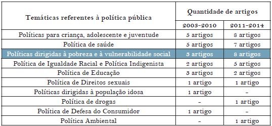 Entre as três políticas públicas mais discutidas no período dos governos PT, duas estavam presentes em artigos selecionados no período dos governos FHC: política pública de saúde e política pública dirigida à criança, ao adolescente e à juventude. Como apresentado na metodologia, discutiremos no período entre 2003 e 2014 os artigos referentes à “Políticas Públicas dirigidas à pobreza e à vulnerabilidade social” (11 artigos).