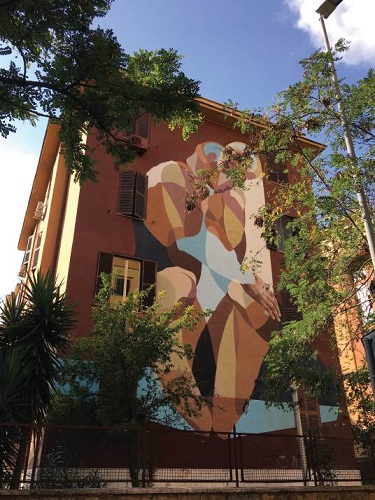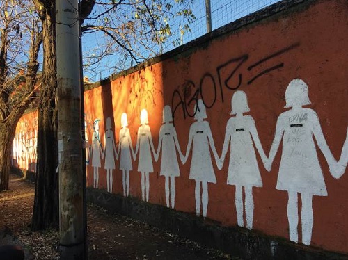 Pode-se observar também que no Bairro de San Lorenzo encontra-se uma obra (Fig. 5) que a artista Elisa Caracciolo produziu contra o feminicídio, durante o Dia Internacional de combate à Violência contra a Mulher em 2012. A obra está em um muro ao longo da Via degli Enotri e Via dei Sardi e é composta por desenhos de 107 mulheres, de mãos dadas, com vestidos brancos, em memória das vítimas de feminicídio na Itália. Em cada desenho há o primeiro nome de cada mulher e o modo como foram mortas. Essa obra também representa um modo frequente de articulação entre as artistas de grafite ou street art e os movimentos sociais feministas, o que a faz, sob certa perspectiva, uma obra coletiva. Vale ressaltar que San Lorenzo é um bairro histórico pela luta democrática e de resistência antifascista em Roma, uma zona popular, operária e universitária da cidade, onde se situam L'Associazione Nazionale Partigiani, diversos coletivos feministas e da diversidade sexual.