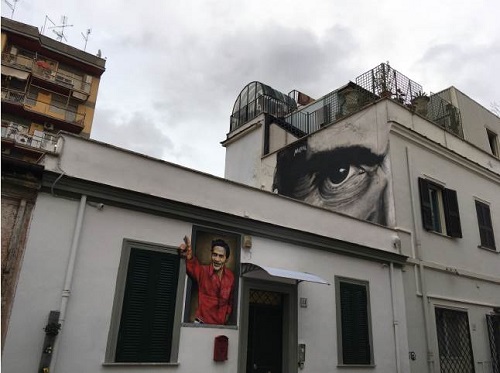 Outro exemplo é situado em uma das pequenas ruas no bairro de Pigneto (Fig.2) com um grafite do famoso artista Maupal em homenagem a Pier Paolo Pasolini (cineasta italiano), realizado na rua onde foi filmado Accanto, um de seus filmes. Frequentemente, pessoas são vistas fotografando e fotografando-se com a imagem desse grafite. E nesse microterritório, sob os olhos de Pasolini, temas como sexualidade e homossexualidade, política e crítica às normas sociais e ao fascismo se encontram, visto que são temas de seus filmes, mas também de sua própria vida, encerrada ao ser assassinado em novembro de 1975. Esse é um bairro com uma história operária e de lutas da esquerda e ainda hoje uma referência para encontros de intelectuais, artistas, estudantes e militantes de esquerda, com presença visível da comunidade LGBT.