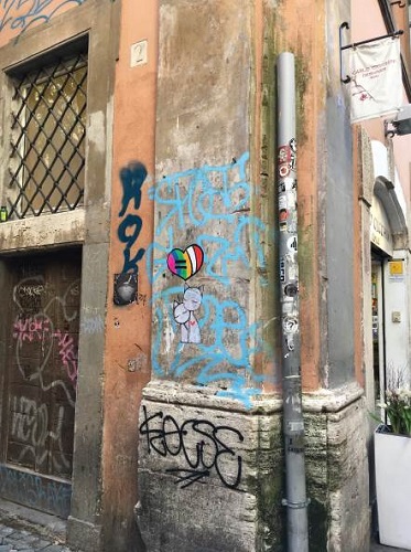 Diferentemente dos grafites analisados (Fig. 1 e Fig. 2), que foram autorizados e não anônimos, o que parece enfraquecer a potência transgressiva da prática de produção de grafites, destaca-se o mural encontrado (Fig. 3) próximo à praça da Igreja de Santa Maria de Trastevere, principal ponto turístico do bairro. Situado na Via della Lungaretta, este mural é local de observação, fruição e fotografias de turistas e moradores do bairro, já que a cada momento uma nova intervenção de grafite é realizada, compondo uma polifonia de temas, imagens, técnicas, cores, e, ao mesmo tempo, revelando desgastes e novidades.