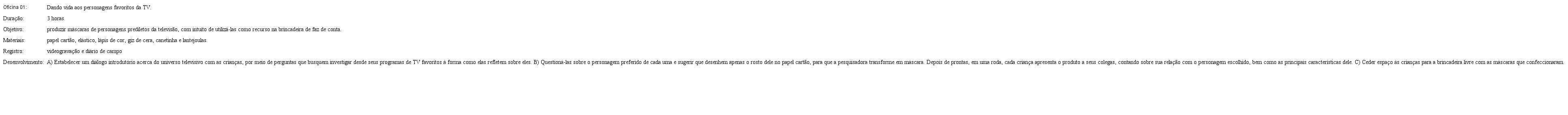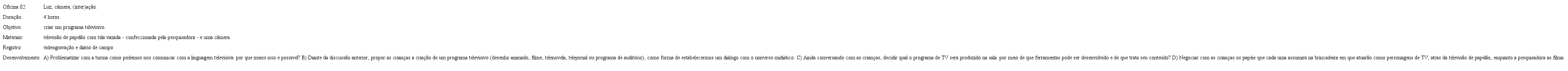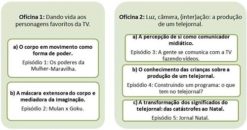 A segunda etapa, por sua vez, compreendeu a participação direta da pesquisadora por meio da realização, com as crianças, de duas oficinas lúdicas com temas que faziam alusão ao universo midiático-televisivo. As oficinas consistiram em atividades que tiveram por objetivo promover espaços para a vivência de diferentes situações lúdicas (com foco na emergência do pensamento simbólico e da assunção de papéis, o faz de conta), bem como para diálogos, entre as crianças e a pesquisadora, que problematizassem a relação das crianças com a mídia televisiva. Não foi adotada a perspectiva de pesquisa-intervenção, pois as oficinas tiveram por objetivo somente propiciar um ambiente para gerar informações importantes para a pesquisa. Com base nisso, as duas oficinas foram delineadas conforme as Tabelas 1 e 2: