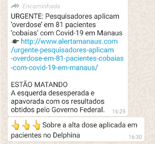 Em 16 de abril de 2020, a propagação de mensagens de textos e vídeos em aplicativos de mensagens e redes sociais, como o Facebook®, continua mobilizada. Com tom de “alerta” à sociedade, circula uma mensagem “denunciando” o caso dos/as pesquisadores/as de Manaus que “estão matando vidas”. Acompanhada de um link para acesso em um site de notícias (Figura 1), o alerta apresentou afirmações de que era um ato gerado pela “esquerda”. O conteúdo do material que circulou fez emergir uma análise nossa, de que o objetivo era alertar a sociedade que pesquisadores/as tinham uma posição política - eram de esquerda - e isso seria um “motivo” para que o estudo não tivesse credibilidade. Frente a nossa análise, o texto forjou-se mediante a teoria de que se produziu uma estratégia para fraudar os resultados obtidos pelo governo federal e, nesse sentido, eles estavam matando através de “overdose” em 81 pacientes com Covid-19, chamados de “cobaias”: