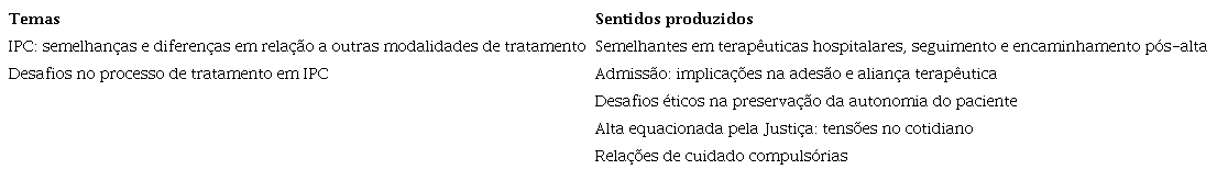 Compreendemos, como aponta Fortes (2010), que a IPC, “como uma medida judicial, não pode ser questionada legalmente … embora sobre a ótica técnica e ético-moral, mereça discussões profundas” (p. S328). Buscamos, em nosso estudo, participar dessa discussão sobre a ótica técnica e ético-moral dando visibilidade aos sentidos produzidos com equipes de saúde mental sobre a IPC e sobre os desafios que enfrentam em seu cotidiano.