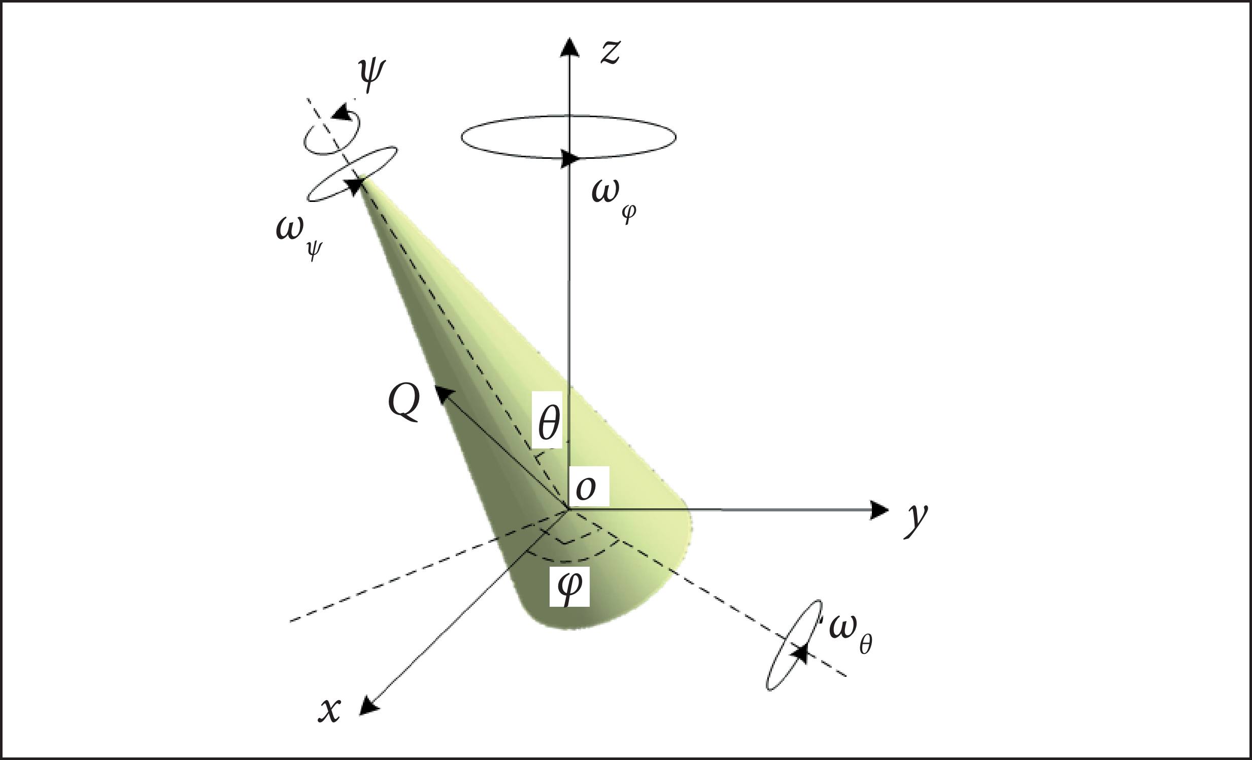 Nutation: considering coning angular rate is ωΨ, initial coning angle is φ0, initial nutation angle is θ0, swing amplitude is θs , swing angular rate is ws, and initial swing phase is θs0, then the coning angle φ and the nutation angle θof the nutation model can be expressed as: