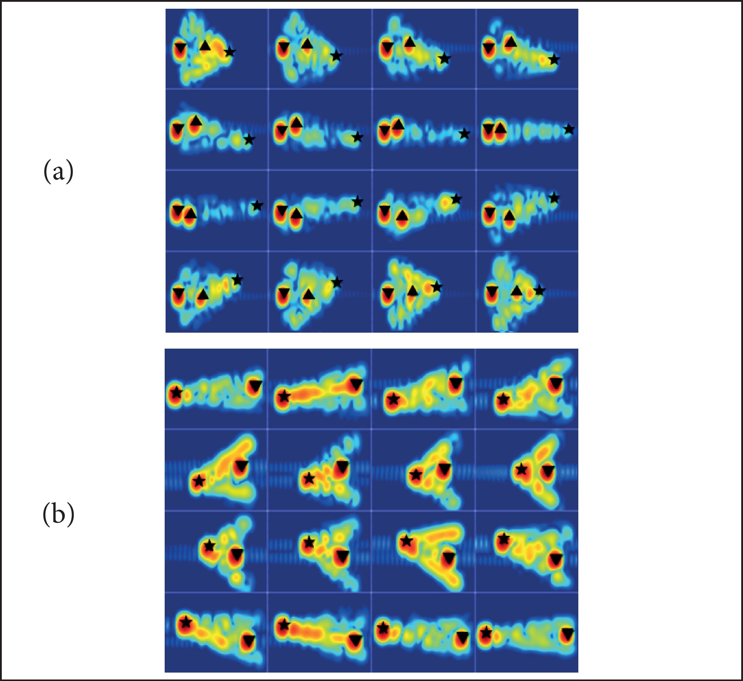 In the ISAR image sequence from Fig. 3 to Fig. 5, the five-pointed stars represent the theoretical projection position of the cone node scattering A, the inverted triangles represent the theoretical projection position of the cone bottom scattering B, and the triangles represent the theoretical projection position of the cone bottom scattering C. It is not difficult to find that the theoretical value of the scattering source’s projection on the imaging plane is in good agreement with the position of the strong scattering source center in the ISAR image, which shows the accuracy of the imaging algorithm and the projection trajectory formula of the scattering source.