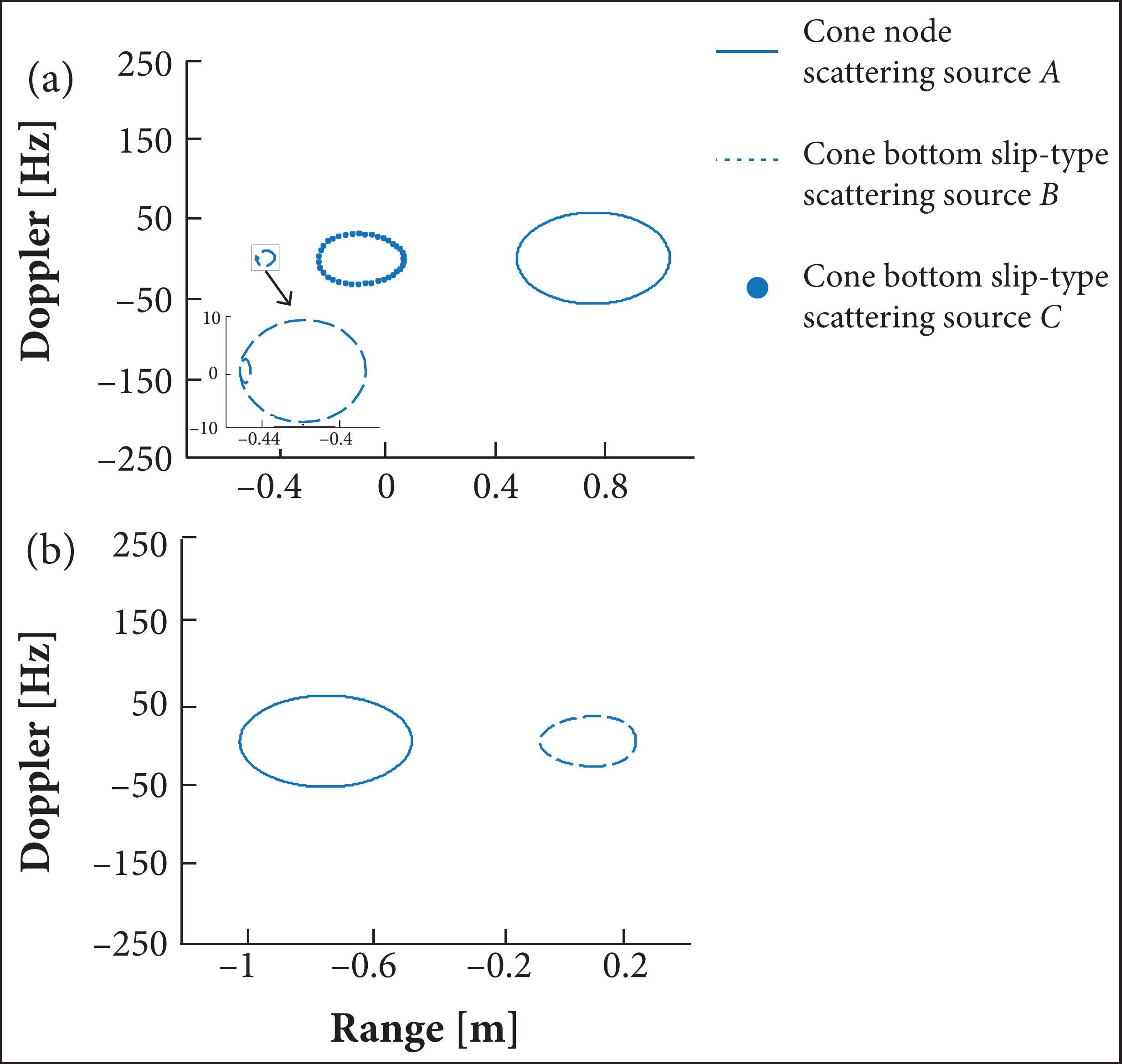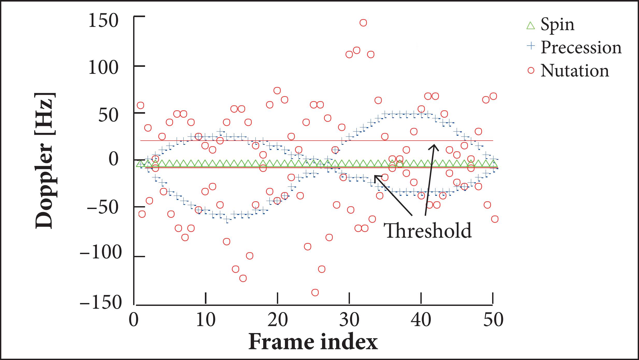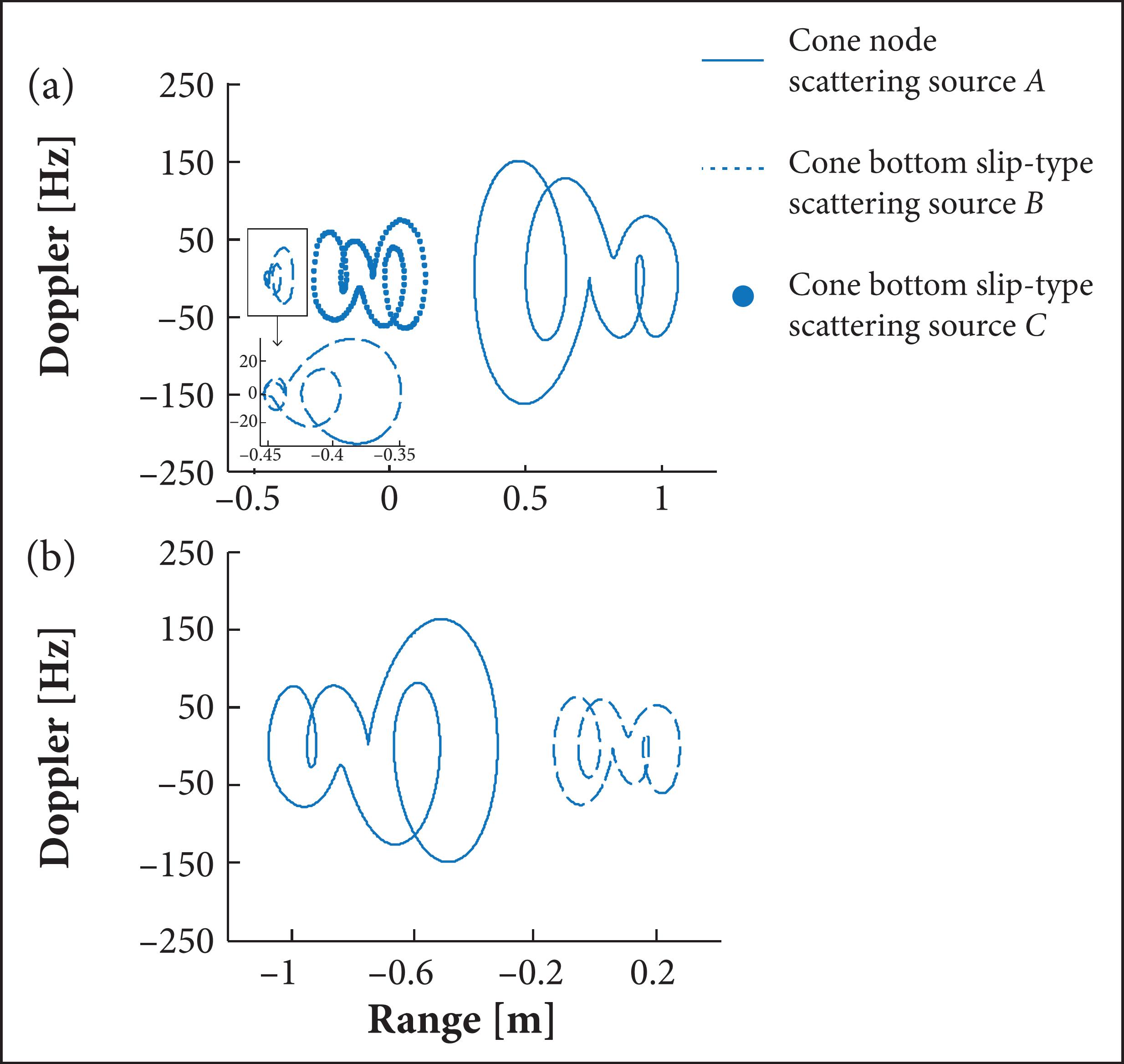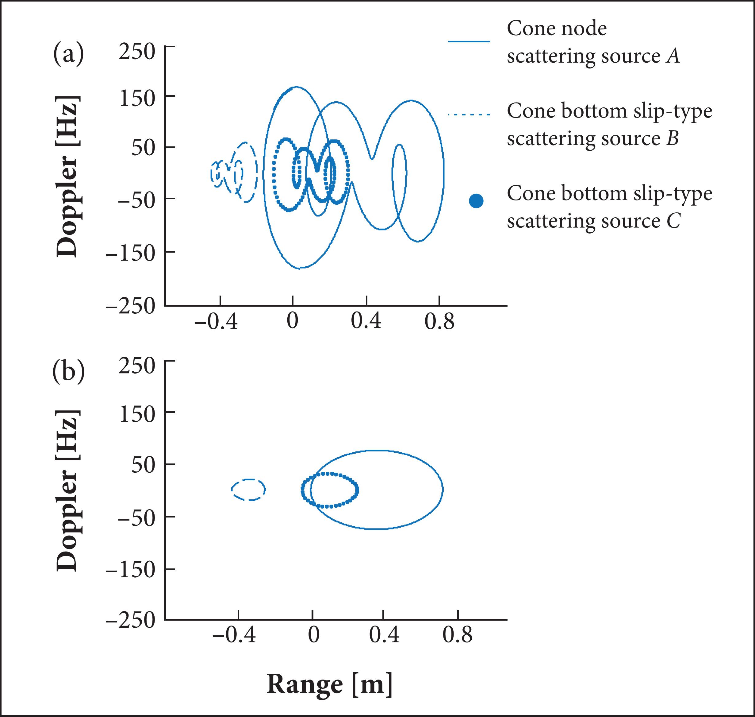 By Eqs. 7 and 8, the Doppler frequency shift of the precession cone target’s cone node scattering source can be given as: