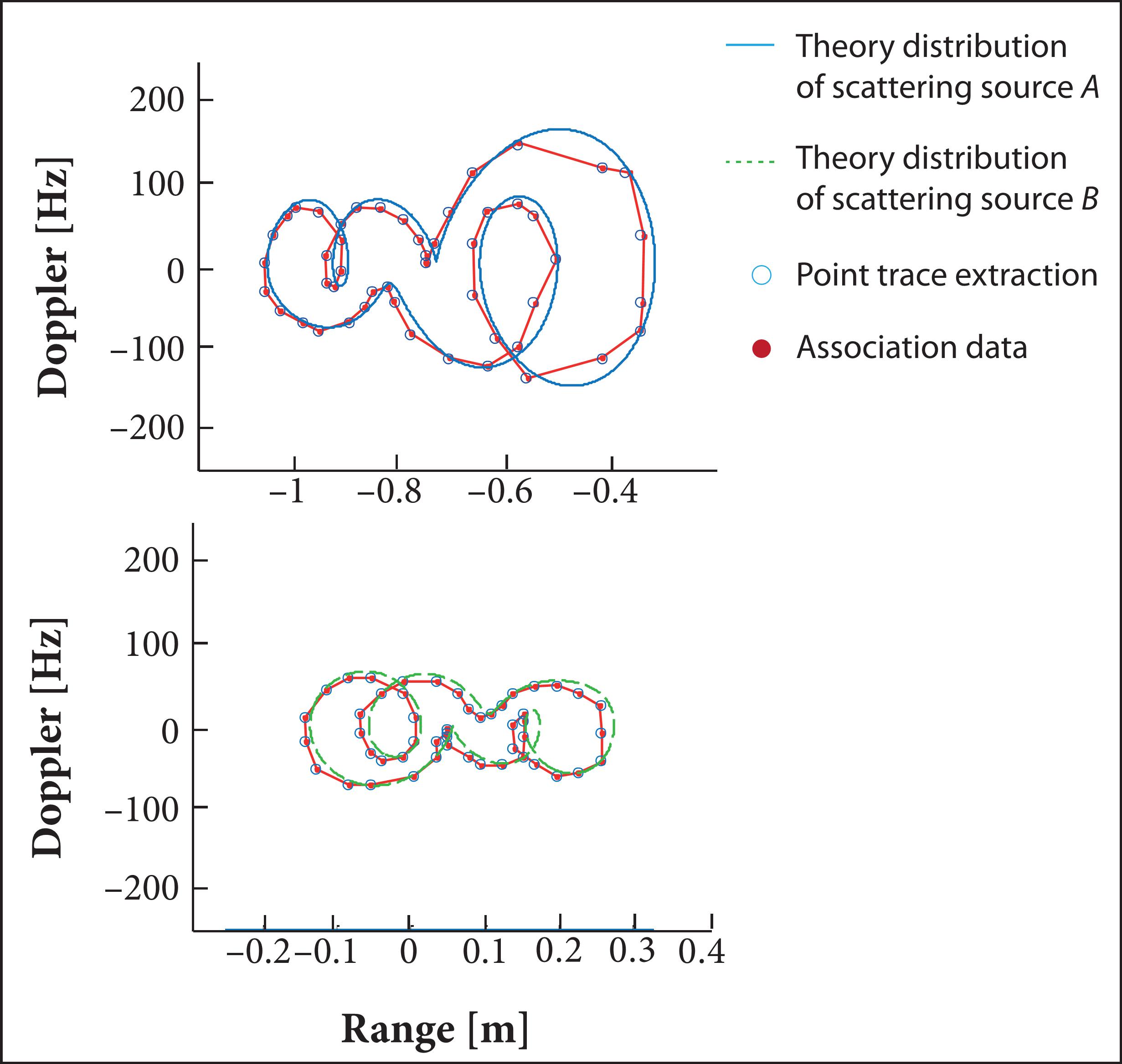 In the recognition of micro-motion, the CLEAN algorithm (Caner 2012) can be used to extract the coordinate information of the peak value of the image to get the coordinate information of the point trace. The scattering intensity of the strong scattering source is not always strong under all conditions; under some radar observation angle, the scattering intensity of the cone node strong scattering source may be weak, such as the ISAR images in the second row of Fig. 3a. The scattering intensity of the cone node strong scattering source is weak. It is hard to extract cone node strong scattering source by the CLEAN algorithm, but the cone node strong scattering source is located in the cone node and can be manually extracted by the position of the pointed cone in the ISAR image’s cone contour. Then, the Doppler domain value of the strong scattering source on the imaging plane should be judged. If it is smaller than the set threshold, its corresponding micro-motion form is considered spinning. Otherwise, it is precession or nutation. Then a line segment set is established through connecting the strong scattering sources among adjacent ISAR image sequences; the number of cross points is counted by judging whether line segments intersect. But sometimes the projection trajectories of the different scattering sources overlap, as show in Fig. 8, which has a certain impact on the number of cross points statistics. In addition, single ISAR image exists in multiple scattering centers, so the projection of multiple scattering sources at the adjacent time needs to be related. Therefore, it is necessary to separate the projected trajectory of each scattering source. In this paper, the projection trajectory of the cone target’s strong scattering source on the imaging plane is interpreted as the track of target tracking. The target tracking technique is applied to extract the projection trajectory of each scattering source in the ISAR image sequence.
