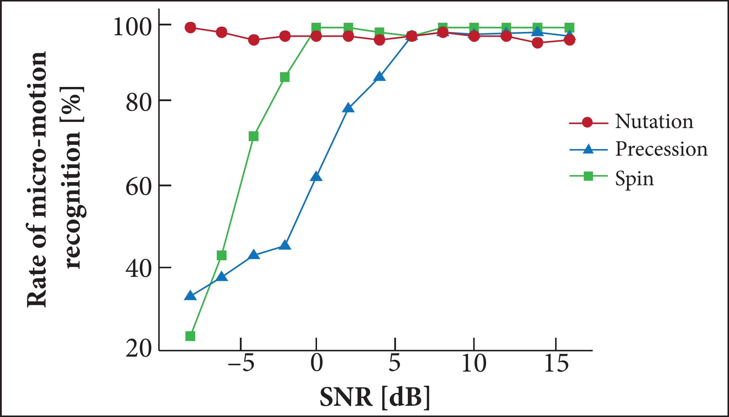 From Fig. 14, we find that nutation target has always maintained a high recognition rate. With the increase of the SNR, precession target and spinning target first increase and then keep stable. This is due to the high level of noise when the SNR is very low, and the location of the extracted scattering source has a large randomness, then the Doppler frequency shift value of the spinning target’s extracted point trace exceeds the threshold, and the precession target’s cross points increase. Thus, in low SNR, spinning target and precession target are identified as nutation target, and nutation target is still recognized as nutation target. When the SNR is big enough to affect the scattering center extraction, spin targets and precession targets are accurately identified. At the same time, it can be found that all kinds of target recognition rates are more than 90% when the SNR is higher than 6 dB, which shows that the proposed algorithm has a good performance of micro-motion recognition in the case of high SNR.