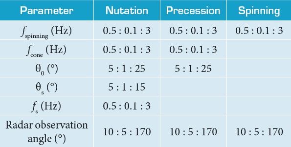 According to the previous analysis, there is a big difference in the projection trajectory of the cone target’s strong scattering source under different kinds of micro-motion on the imaging plane. For the same cone target model, according to Eq. 11 to Eq. 13, the characteristics of the projection trajectory under the micro-motion parameters and radar observation angle parameters as shown in Table 1 are analyzed.