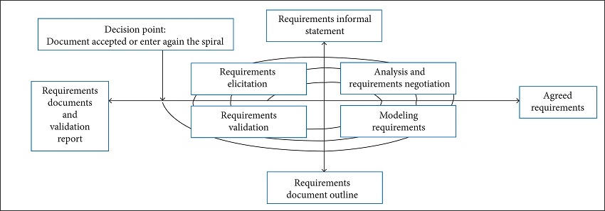 The ER process consists of four main steps: survey and elicitation, analysis and negotiation, modeling, and validation. These steps occur iteratively and recursively due to changes that occur during the development process, as can be seen in the spiral model shown in Fig. 1.