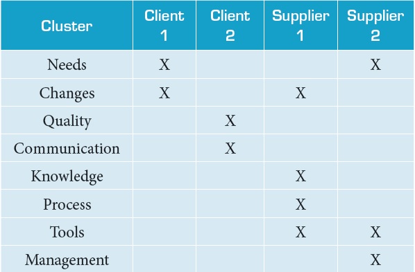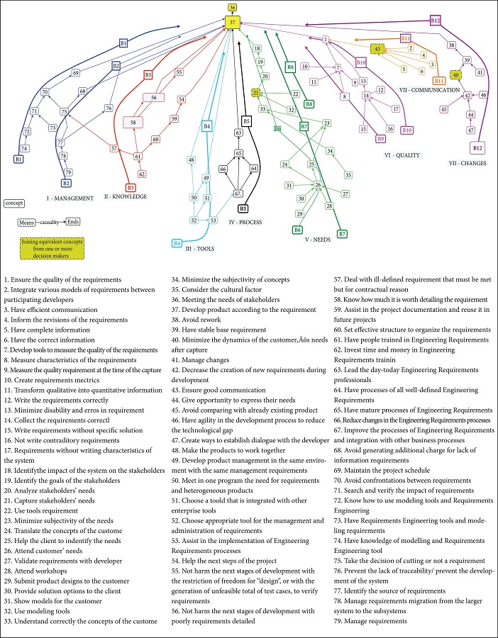 The individual meetings with the clients and the suppliers were performed. Each decision maker shared his experience about the problems that usually occur in the requirements elicitation process. The advantage of the individual interviews was that each decision maker was not influenced by the ideas of the others. Decision makers talked about their values, experiences and, although their vision on relevant aspects of ER was differentiated, all of them agreed in one main goal which is to develop the product to meet the stakeholders’ needs. Even with this same goal, the map was enriched due to the different concepts, as critical issues were addressed in ER, which is observed in the heterogeneity of the clusters. The result was to obtain a more comprehensive problem view in the area. This can be seen when one looks at the amount of concepts that were united with other similar, and, of a total of 81 concepts, only three were gathered (marked with gray boxes in the assembled map), in addition to the main objectives to produce a system and meet the stakeholder’s needs. The great majority of related concepts are influenced by links. To make the clusters, we chose to include the ultimate goal in each one, aiming to carry out the analysis as a single map
