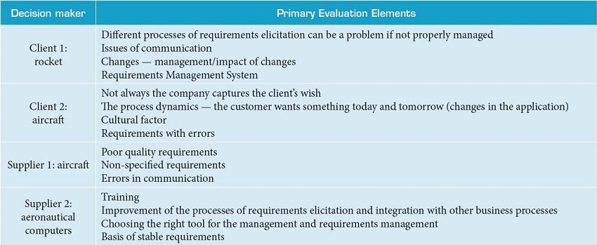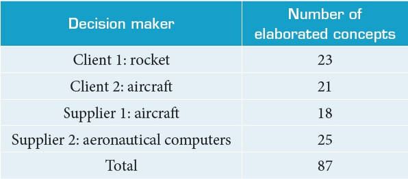 Initially, an individual approach was carried out through interviews with each decision maker separately. The interviews were conducted in a neutral environment for both the decision makers and the facilitator, lasting between 60 and 90 minutes. Besides the interviews, additional information was requested to the suppliers about the description of the main difficulties faced by them concerning aerospace products in clustered environment in the city of São José dos Campos. It was asked to all decision makers to establish label(s) to the relevant problem(s), with total freedom of expression.