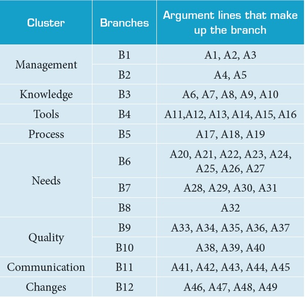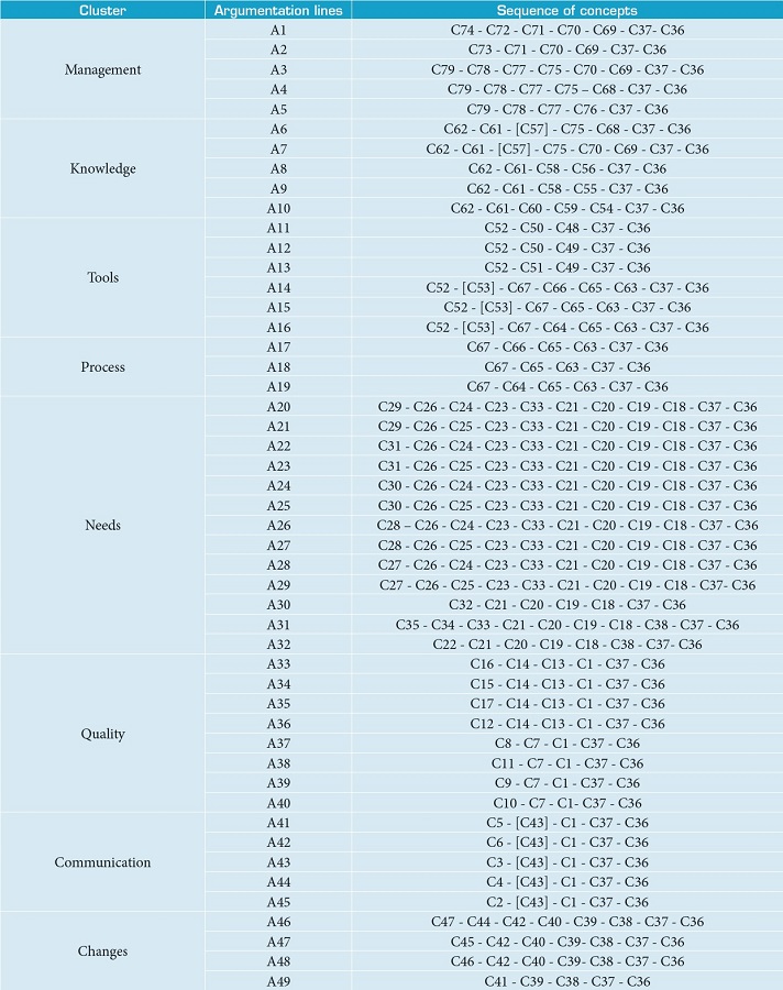 Based on the argumentation lines, we seek to detect the branches of the map, i.e. the set of argumentation lines that congregates similar concerns in the context. Table 5 shows the branches identified in the analysis in the congregated cognitive map, and shown in the Fig. 2 as lines of argumentations.