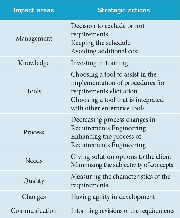 The present study resulted in four individual cognitive maps and a congregated map that allowed identifying the difficulties in requirements elicitation process for building complex systems, in this case, directed to the development of aerospace products in São José dos Campos. The maps revealed eight areas of interest (clusters) which concentrated most of the difficulties detected. Table 6 shows the strategic actions, revealed by the map, to analyze impacting actions.
