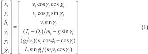 where: i = 1, 2, …, n is the index of multiple UAVs under consideration. For UAVi, xi is the down-range; yi is the cross range; hi is the altitude; vi is the ground speed; yi is the flight path angle; χi is the heading angle; Ti is the engine thrust; Di is the drag; mi is the mass; . is the acceleration due to gravity; ϕi is the banking angle; Li is the vehicle lift.