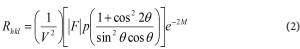 where: V is the volume fraction of the unit cell; F is the structure factor; hkl are the Miller indexes of the reflection plane; p is the multiplying factor associated to the specific hkl plane; θ is the diffraction angle; and e−2M is Debye-Waller Factor (DWF).