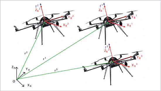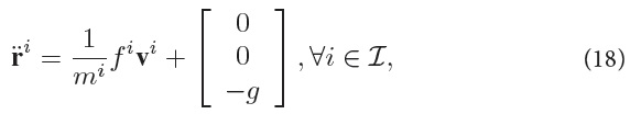 [r1i r2i r3i]T ∈ ℝ denotes the three-dimensional position of CMi; vi ∈ ℝ3 is the unit vector normal to the rotor plane of the ith multicopter; mi is the mass of the ith multicopter; fi is the magnitude of the total thrust produced by the rotors of the ith multicopter.
