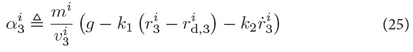 The above control law respects the total thrust magnitude constraint fimin ≤ fi ≤ fimax and is such that, if fimin ≤ αi3 ≤ fimax ,then the vehicle altitude r3i responds to the altitude command rid,3 as if it were governed by a second-order linear time-invariant model. The gains k1 and k2 are design parameters and have effect of proportional and derivative actions, respectively.