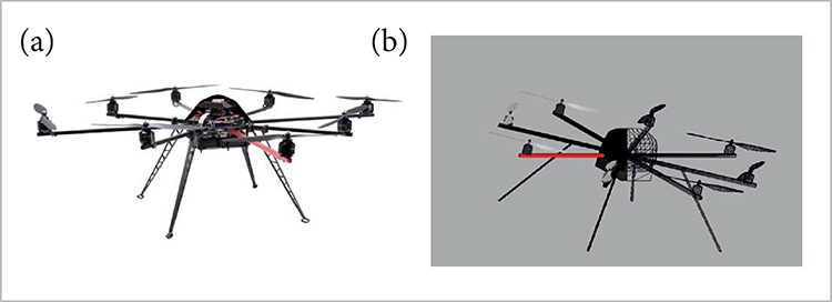 In this study, the multicopter dynamics, its flight environment (gravity, wind, etc.), as well as a graphic visualization of the mission, are modeled in Plane-Maker, the design tool associated with the flight simulator X-Plane. For illustration, we chose the Gyrofly Gyro-200ED-X8 octocopter (Fig. 2a). The corresponding X-Plane model is depicted in Fig. 2b.