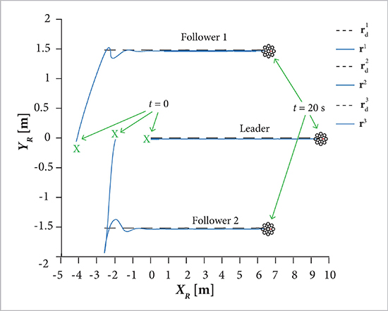 where: t ≥ 0 denotes the continuous time; λ = 0.5 m/s is the longitudinal velocity; h = 2 m is the formation altitude; η = 2.6 m is the longitudinal distance from the CM of the leader vehicle to the CM of the follower vehicles; γ = 1.5 m is the transversal distance from the CM of the leader vehicle to the CM of the follower vehicles.