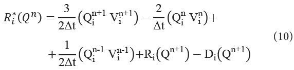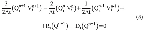 The 2nd-order backward difference scheme is applied to discretize the transient term. This results in the following equation for each finite volume: