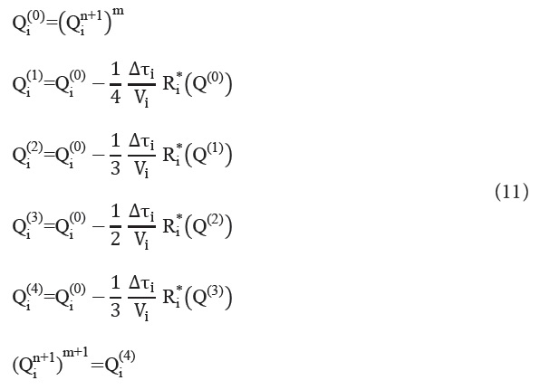 Having known Qn, 4-stage Runge-Kutta scheme is used to solve Eq. 9 for Qin+1, which is first initialized by Qin+1 = Qin, and then the following iteration procedure in pseudo-time, indexed by m, is continued until the convergence of Qin+1 is reached.