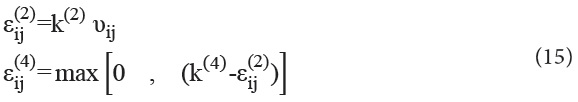 where: k(2) and k(4) are constants in the range of (0.5 < k(2)< 1) and (1/256 < k(4) < 1/32), respectively; υij is the shock sensor which will be defined later.